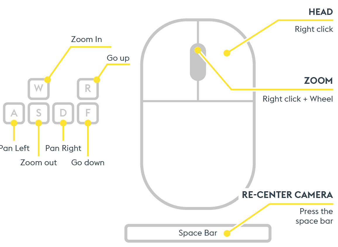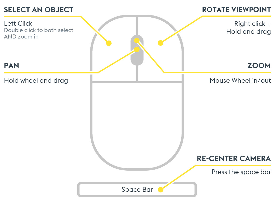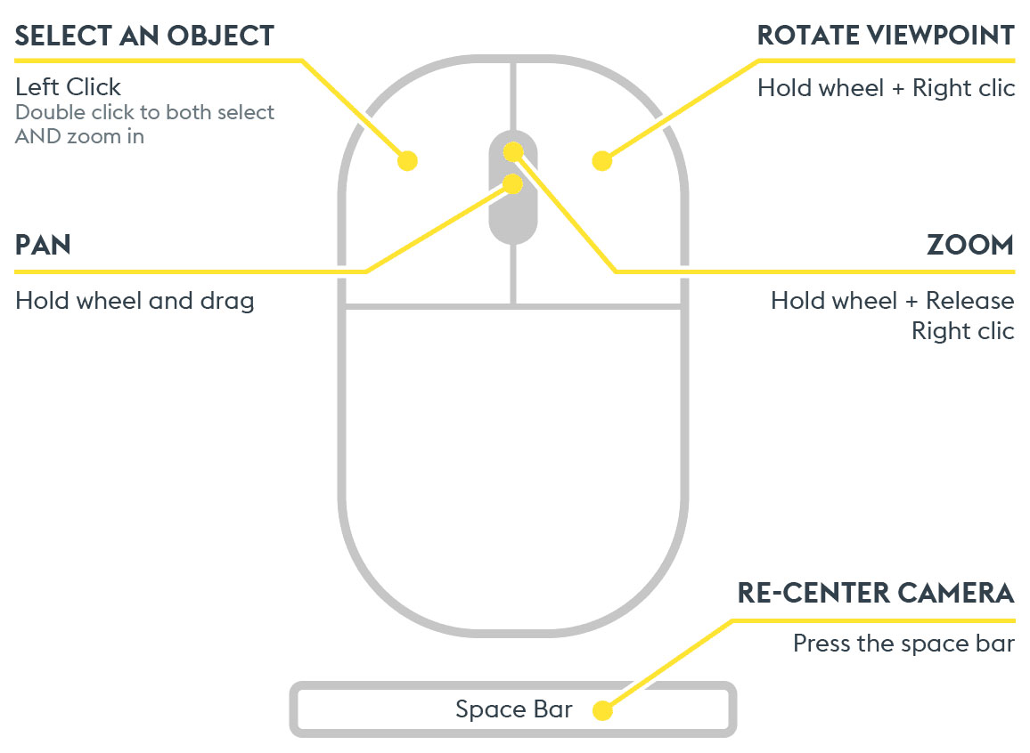 There are three navigation modes: Orbital, Examine Mode, and Fly Mode. By default, the orbital mode is selected. It is the most intuitive for basic use. For more information on the modes, we suggest you watch the discovery tour, available at the software’s opening and in the Help menu, which describes the functions of the keys for each mode.