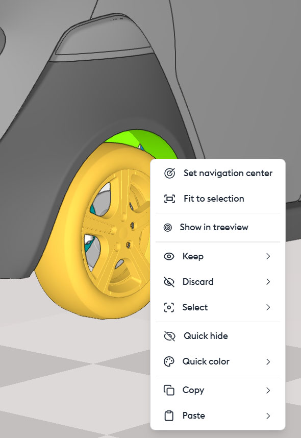 In orbital mode, you can select a central navigation point either by clicking the mouse wheel or by right-clicking/set navigation center. This will set the point around which your camera will move. Scrolling the wheel forward will zoom in on this point, and scrolling backward will move away from the point. Selecting a part with a simple left-click places the central navigation point on that part.