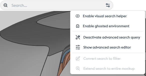 By default, the search only works on visible parts (as defined by the layers). Therefore, the search result might be empty, or you might not find your part. You have the option to override this limitation and perform a global search on all parts of the model using the option in the context menu “extend search to all mockup” An icon will indicate that this part is currently hidden.